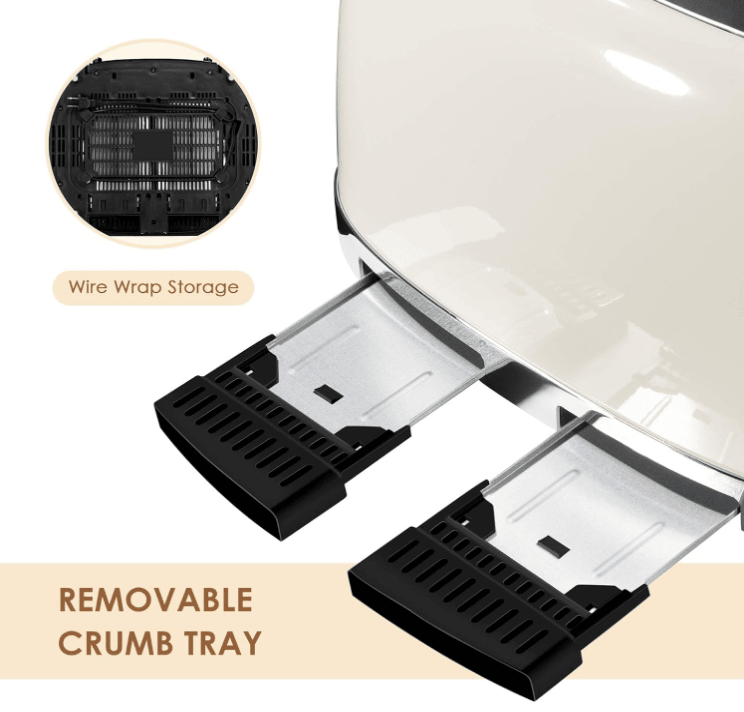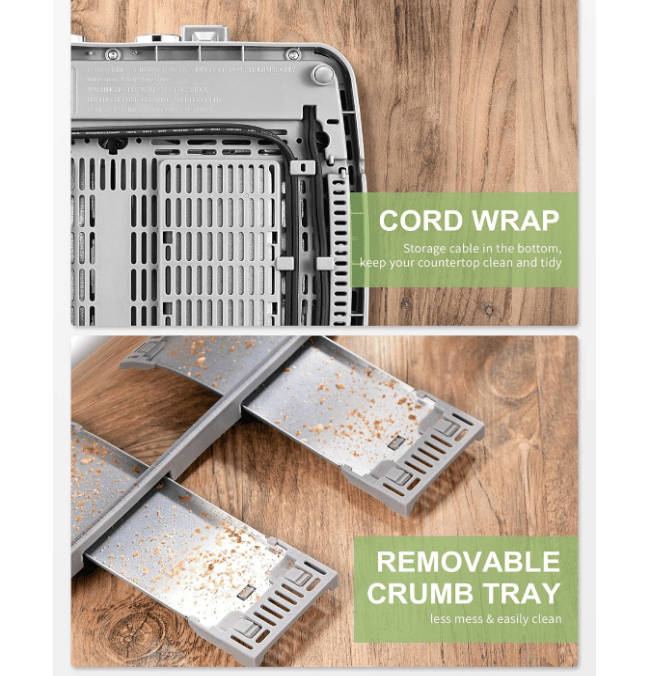 Slide-out breadcrumb tray: Keep your device clean and free of crumbs without causing a mess on the table! Just slide out the tray to easily discard crumbs