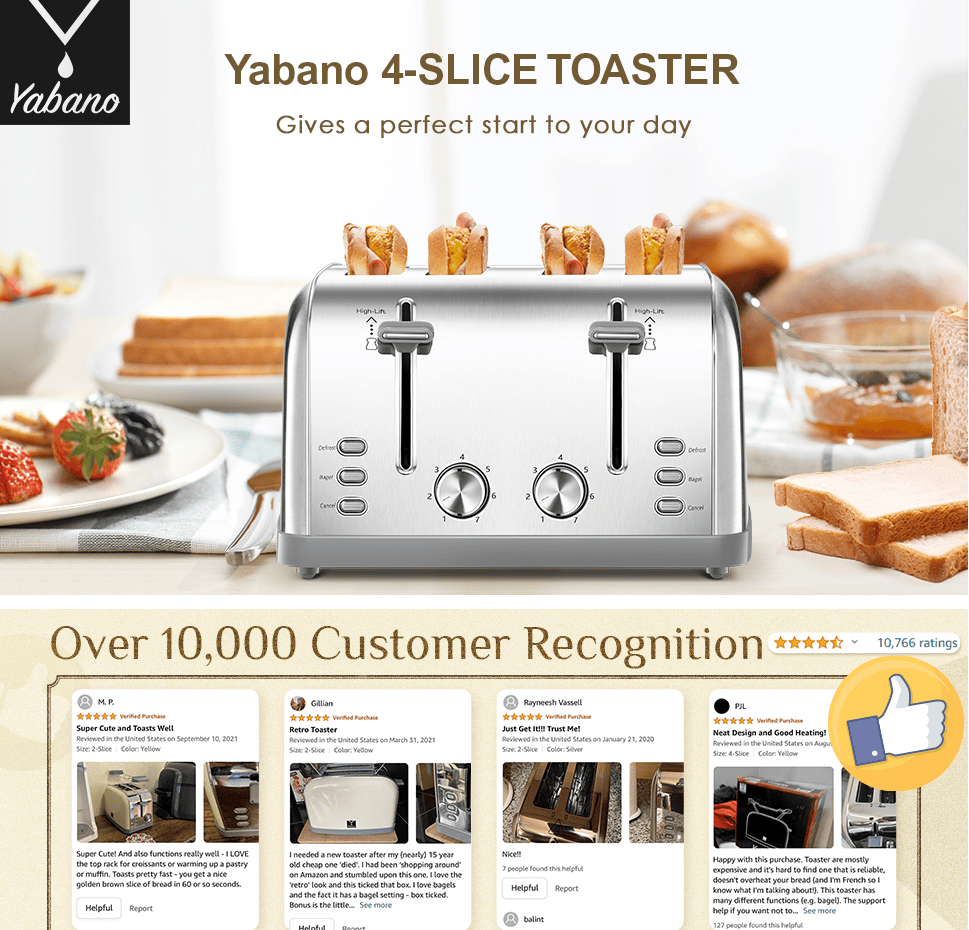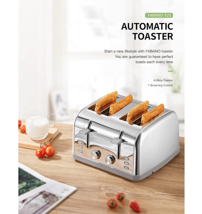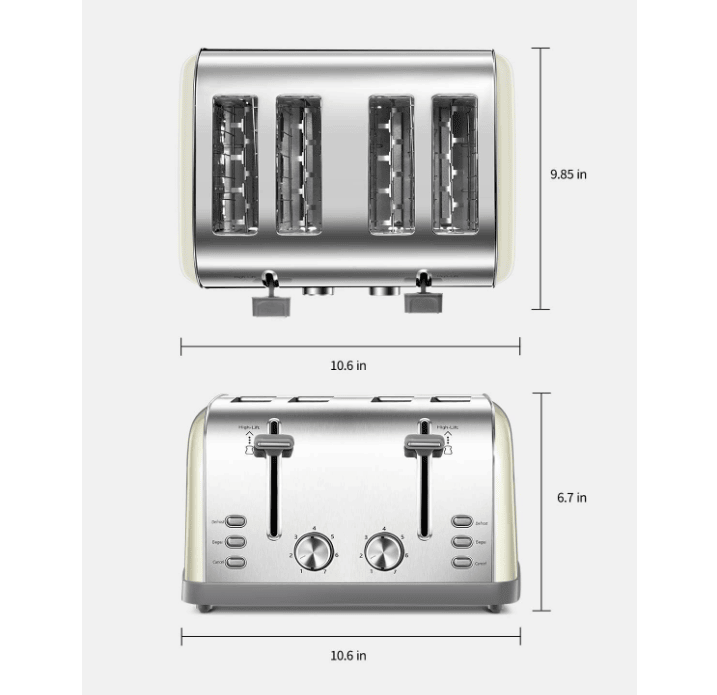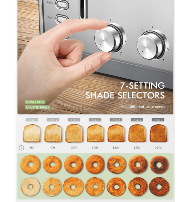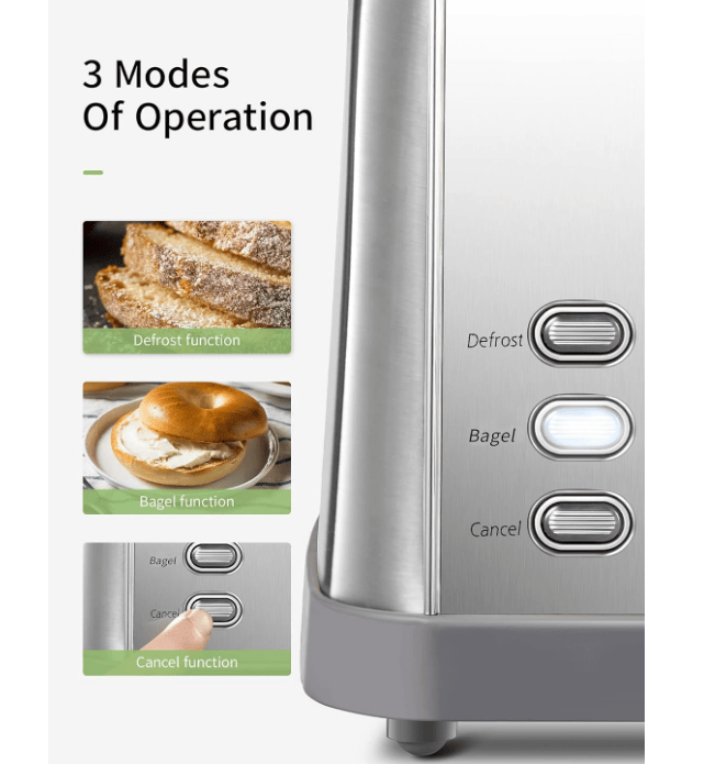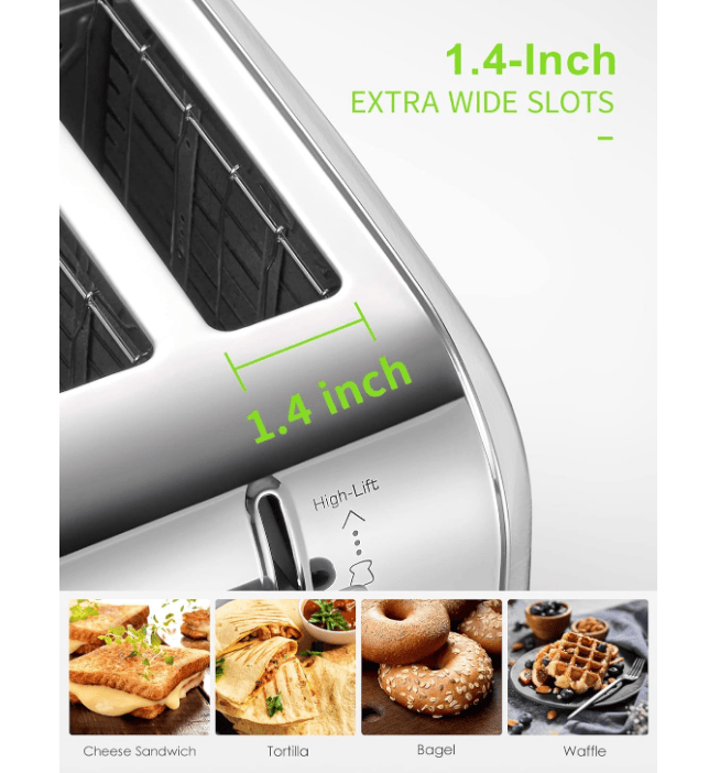 4 extra wide slots: The toaster is made of food-grade stainless steel and comes with an additional 4 wide (1.5 inch) slots for different slices