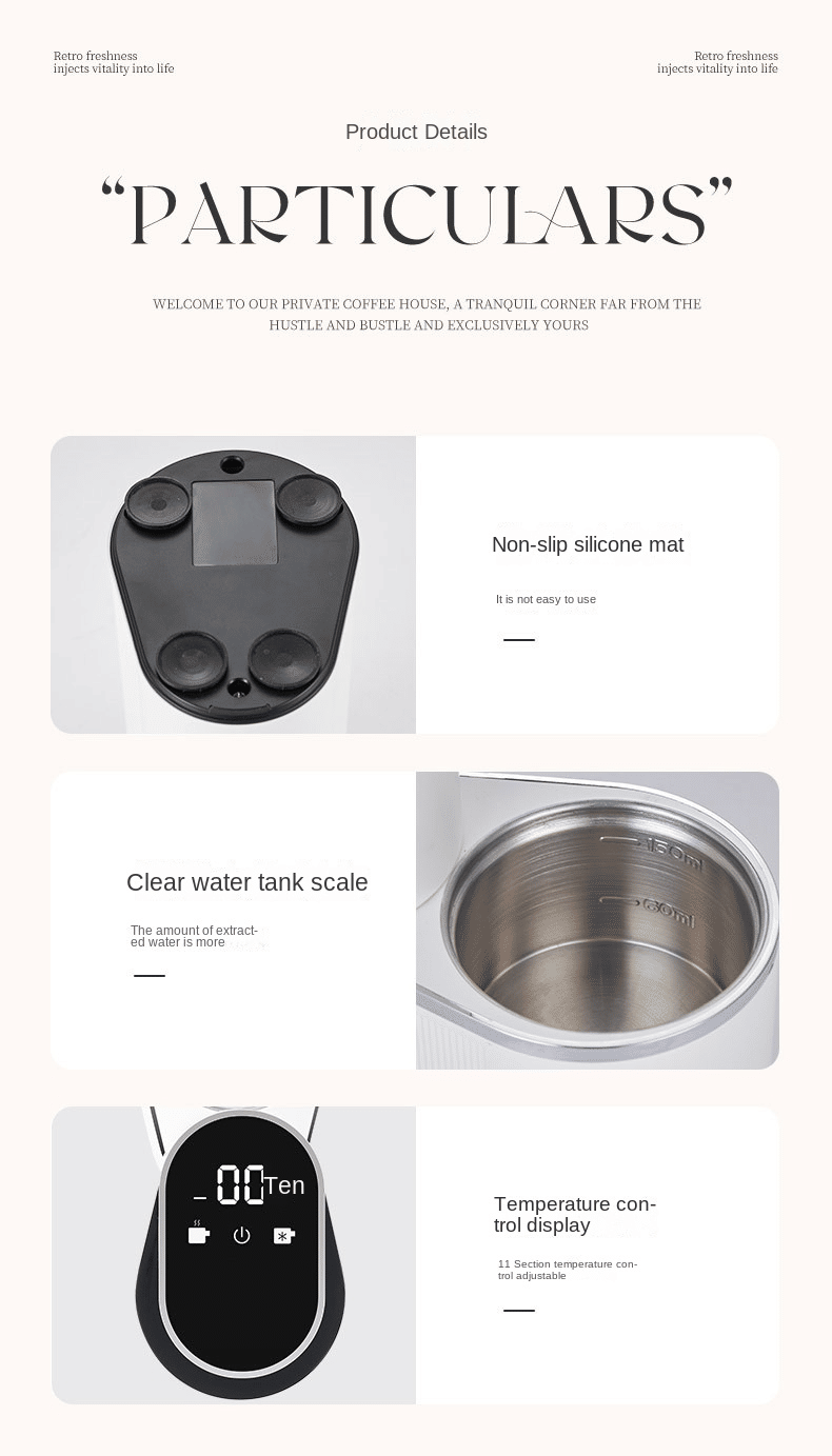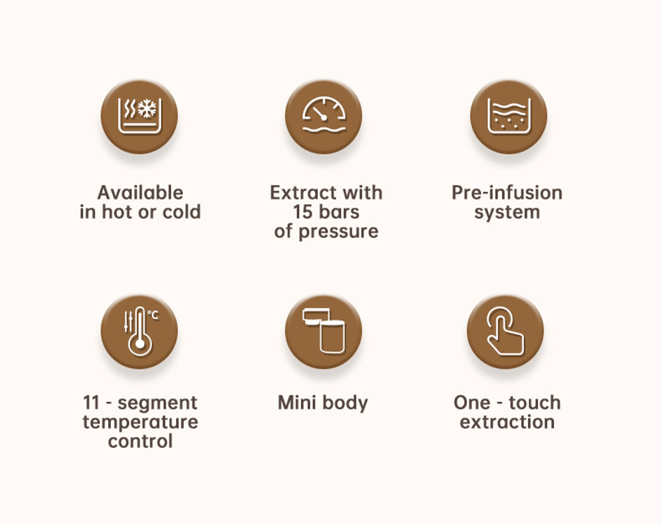 Product features: brewing system, hot water system, programmable, self-cleaning, single service, temperature control, classic texture, light luxury, powerful power, coffee making, portable coffee, car coffee, travel coffee