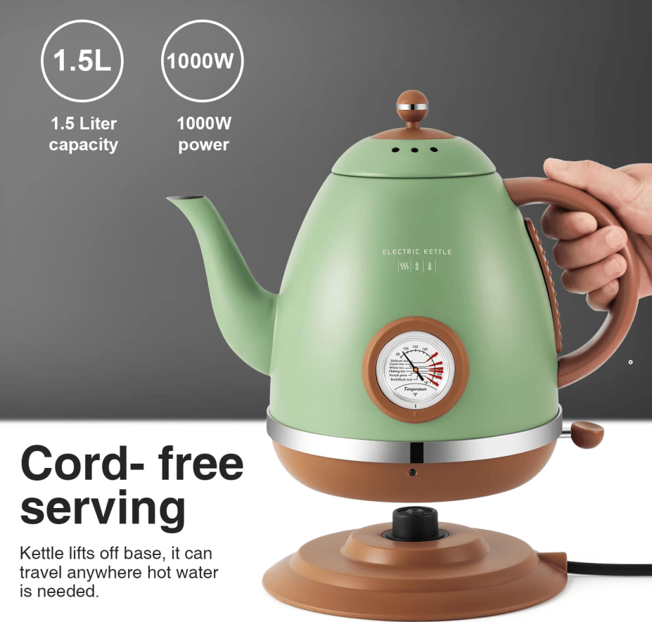 Chic gooseneck electric kettle for accurate dumping: This gooseneck electric kettle is designed to have a sophisticated gooseseneck outlet that provides waterfall water flow at all dumping angles. This makes this electric kettle an excellent hand-brewed coffee pot for your daily coffee and tea.