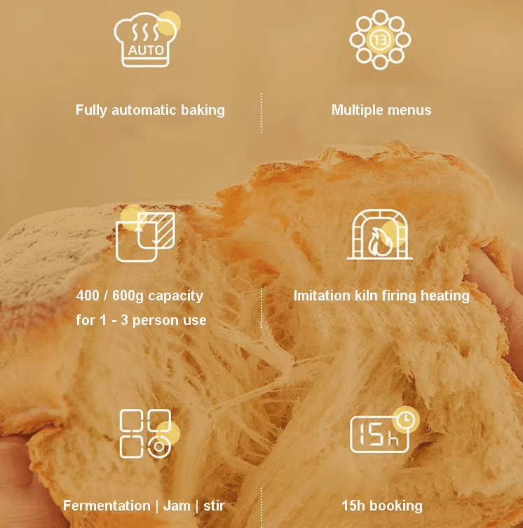 Use function:soft bread,sweet bread,natural sour bread,French bread,whole wheat bread,fast bread,sugar-free bread,multigrain bread,milk bread,cake,raw dough,fermented dough,jam,baking,yogurt