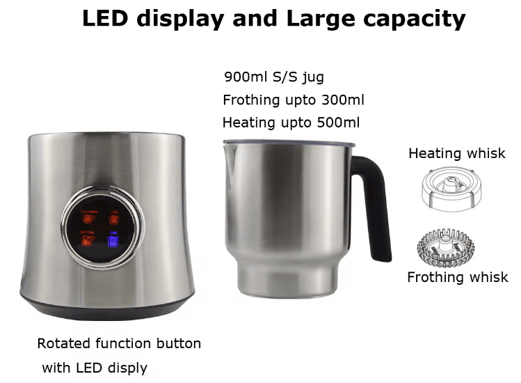 SKU: PSMF06S 500W Electric milk foam device 4 in 1 milk foaming kettle foaming heater hot milk foam machine built-in a healthy milk foam LED control capacity 900ml cold foam 360° rotating base can be disassembled cold and hot milk foam device and steamer SUS304 can adjust the temperature and thickness without BPA milk foam exquisite, good liquidity, cold and hot double automatic foaming intelligent temperature control