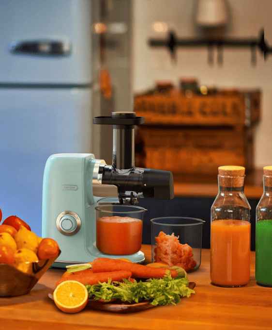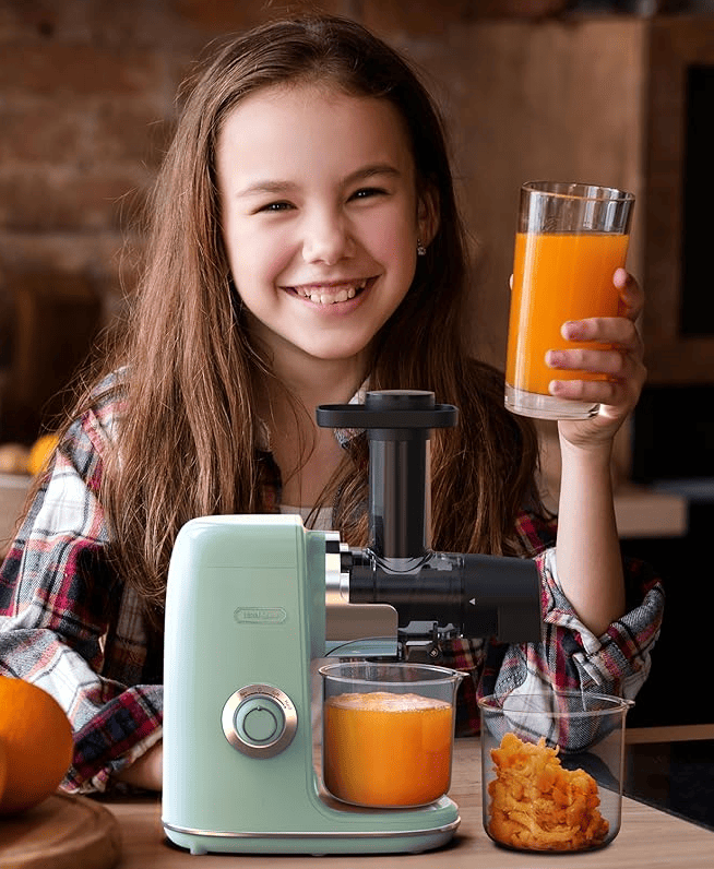 [Easy to clean, no filter] -farewell to the trouble of complex filters!Hazel Quinn The retro cold press juicer has introduced a revolutionary filter-free technological innovation. Cleaning is easy-Save you time and effort by simply flushing the parts. effortlessly intoxicated in the spotless machine.