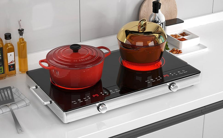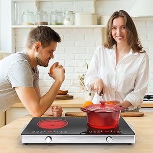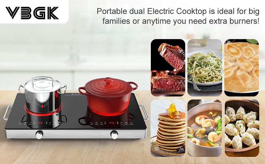 - Multi-function Ceramic Stove:VBGK Electric cooktop 2 burner have 9 power levels 2400W to meet your different choice which is convenient for you to choose the right power to cook a variety of different foods, perfect for braise, fry, simmer, steaming, boil, stir-frying, roast. The heating effect of the electric ceramic cooktop is the same as that of the gas stove, and the food made is as delicious as the gas stove.