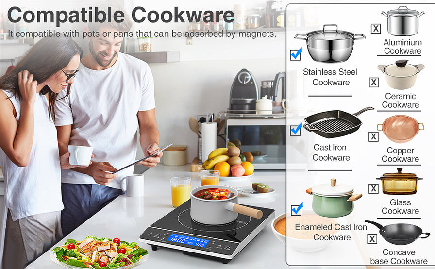 - Compatitable Magnetic Cookware- VBGK Induction Stove Top works with magnetic induction cookware like cast iron, iron, steel, and enameled iron cookware (diameter is between 8cm to 22 cm). The induction cooktop will appear “E0” error code if no cookware detected.