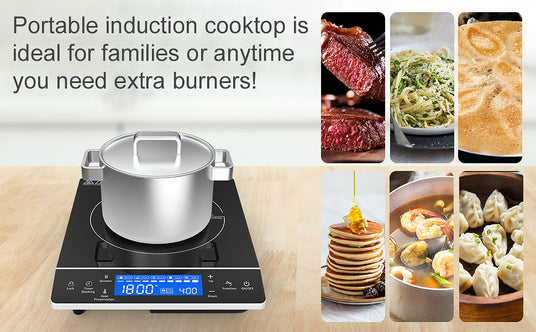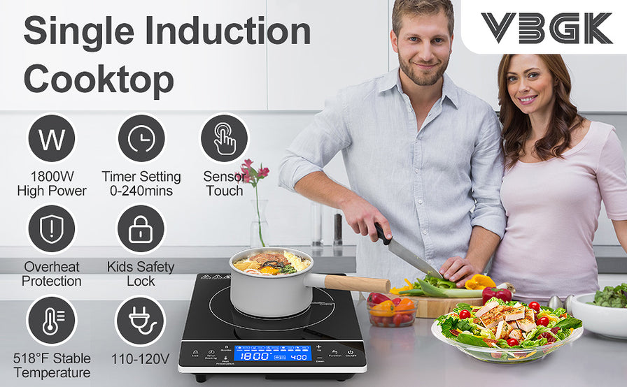 - 9 Power Levels:VBGK Single Burner CooktopChoose from 9 preset power levels 200 to 1800W and settings 176°F to 518°F and 80- 270C°. With an 83% energy efficiency, Single Burner Induction Cooktop is meet your various cooking needs:simmer, deep fry, boil, sauté, sear, steam, slow cook and grill with ease. 2 hours timer provides high-precision operation.