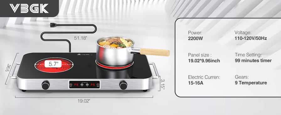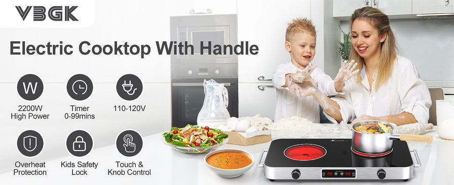 - Portable and Wide Application:VBGK Cooktops Without the need of gas supply and with the small space occupation, the double electric cooktop is very convenient for you to move it to any place you like. And this portable stove is ideal for office use, camping, parties, boats, RVs, student accommodation, traveling or as an extra cooking utensil in your kitchen.