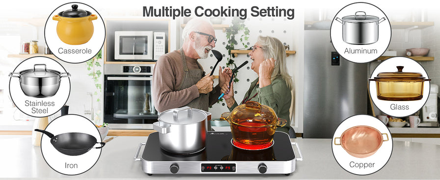 - Compatible All Kinds Cookwares:The 2 burner electric cooktop 110V is used with iron, stainless steel, casserole, aluminum, copper, glass, bbq tray, ceramics, and other induction pots, please use flat-bottomed pots. The surface of the stove top is made of black crystal plate material, which is scratch-resistant, wear-resistant, high temperature resistant.