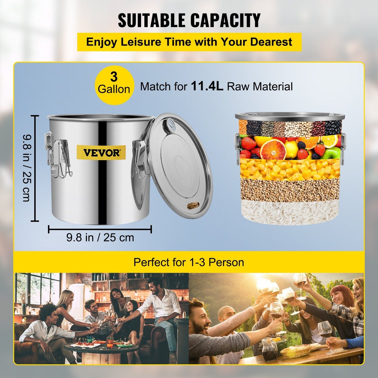 Sufficient Capacity: This alcohol still provides you with a fermentation capacity of 3 gallons. Boiler barrel: 9.8" x 9.8" (25 x 25 cm), condenser: 7.9" x 4.3" (20 x 11 cm), which can ferment up to 11.4 liters of raw materials. Perfect for family-together parties. All parts are made of food-grade materials, including silicone, stainless steel, and copper.
