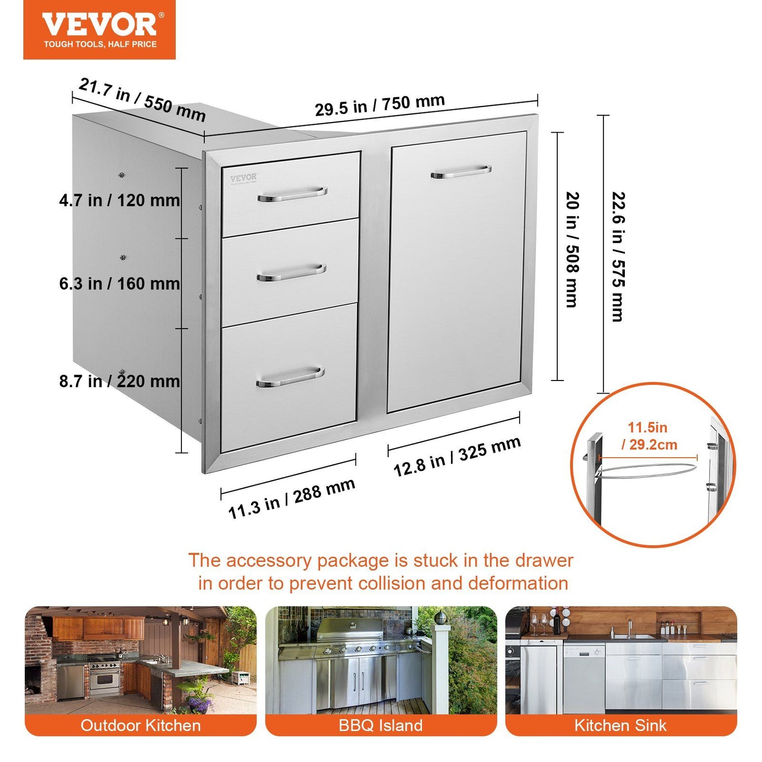 VEVOR Outdoor Kitchen Door Drawer Combo 29.5" W x 22.6" H x 21.7''D, Access Door/Triple Drawers with Propane Drawer and Adjustable Garbage Ring, Perfect for BBQ Island Patio Grill Station - 3 Layers / 29.5 x 21.6 x 22.4 inch is backordered and will ship as soon as it is back in stock.
