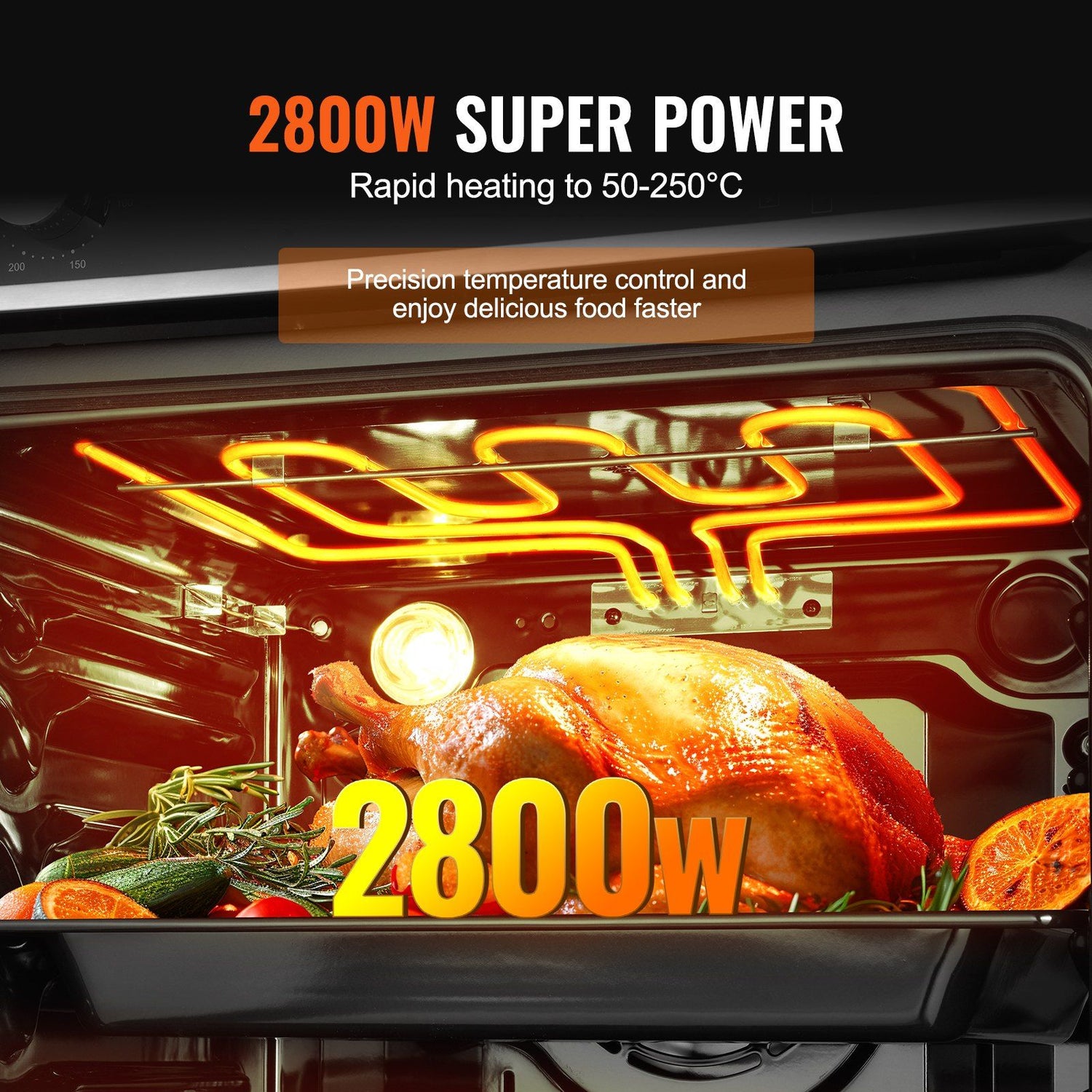 Multiple Heating Modes: With a max output of 2800W, the oven offers 9 automatic programming modes for quick start. Simply twist the knob to begin cooking dishes like cakes, steaks, pizzas, bread, roasts, cookies, and vegetables. It comes with a digital timer for precise cooking time control, making it easy to prepare a variety of delicious meals and making cooking more fun and simple!