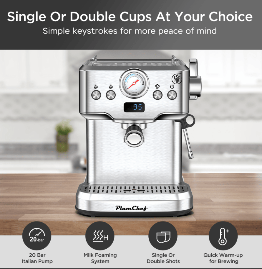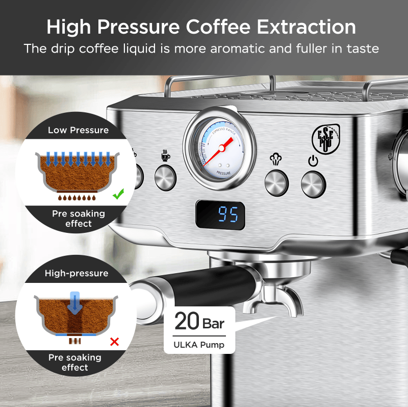 The 20 bar professional espresso machine, with milk foamer, single and double, ESE Pod compatible, visible temperature and pressure display, removable water tank, for cappuccino, latte and macchiato