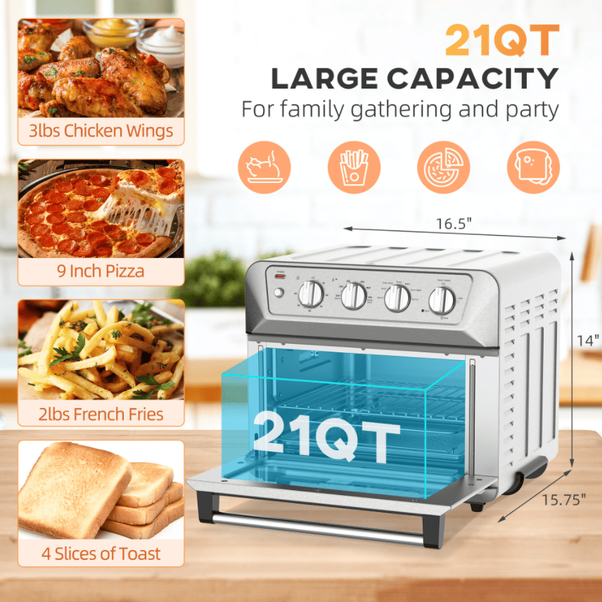 SKU: W2225140828 Air Fryer Toaster Oven, 21QT 7-in-1 Convection Oven Countertop, Pizza, Warm, Broil, Toast, Bake and Air Fry, 4 Accessories Included, 1800W, Stainless Steel Finish, Smart Oil-Free Cooking Air Oven, Separate Filtration 360° ° Air Circulation Timer and Non-Stick Pans Low-Calorie Cooking, Mechanical Knob, Non-Stick Basket Insulated Handle with Heat Protection Multi-Port Heat Dissipation