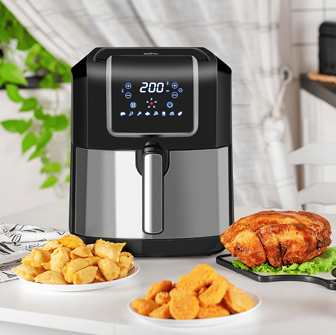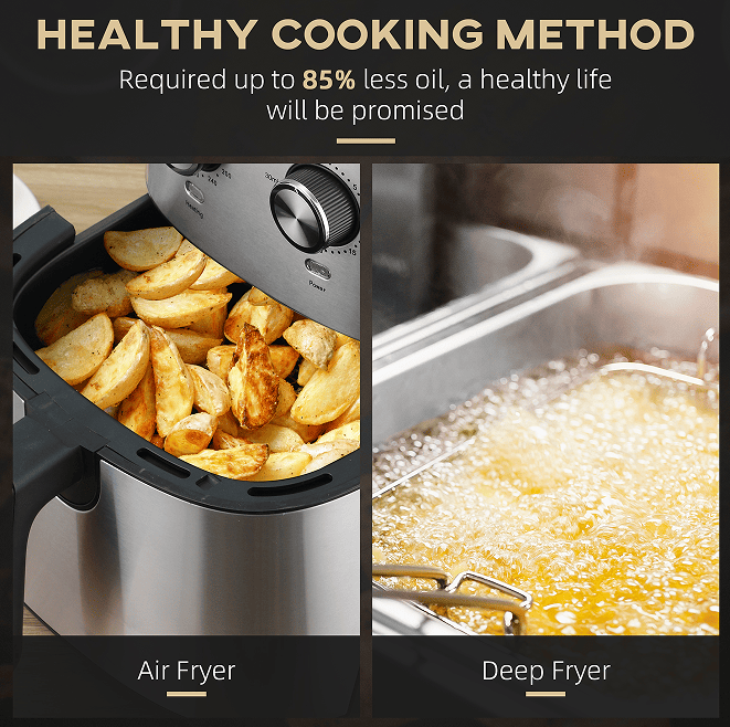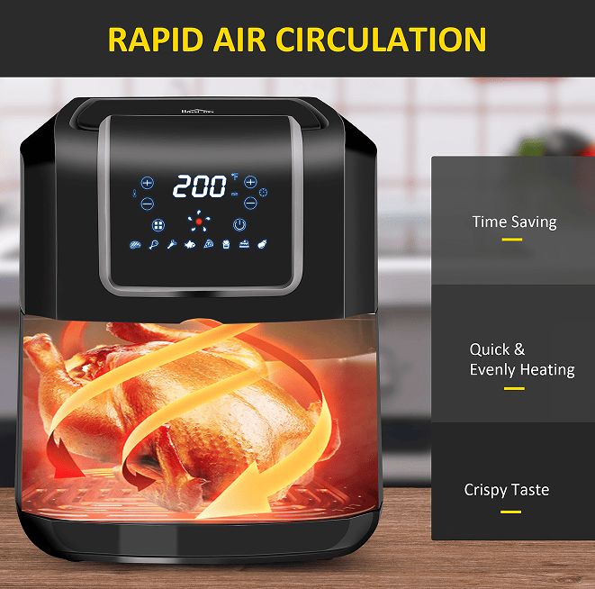 Healthy Cooking Method: This air fryer requires up to 85% less oil, allowing you to enjoy the same delicious crispy fried food, with less fat. The 360° hot air circulation system ensures uniform and fast heating.